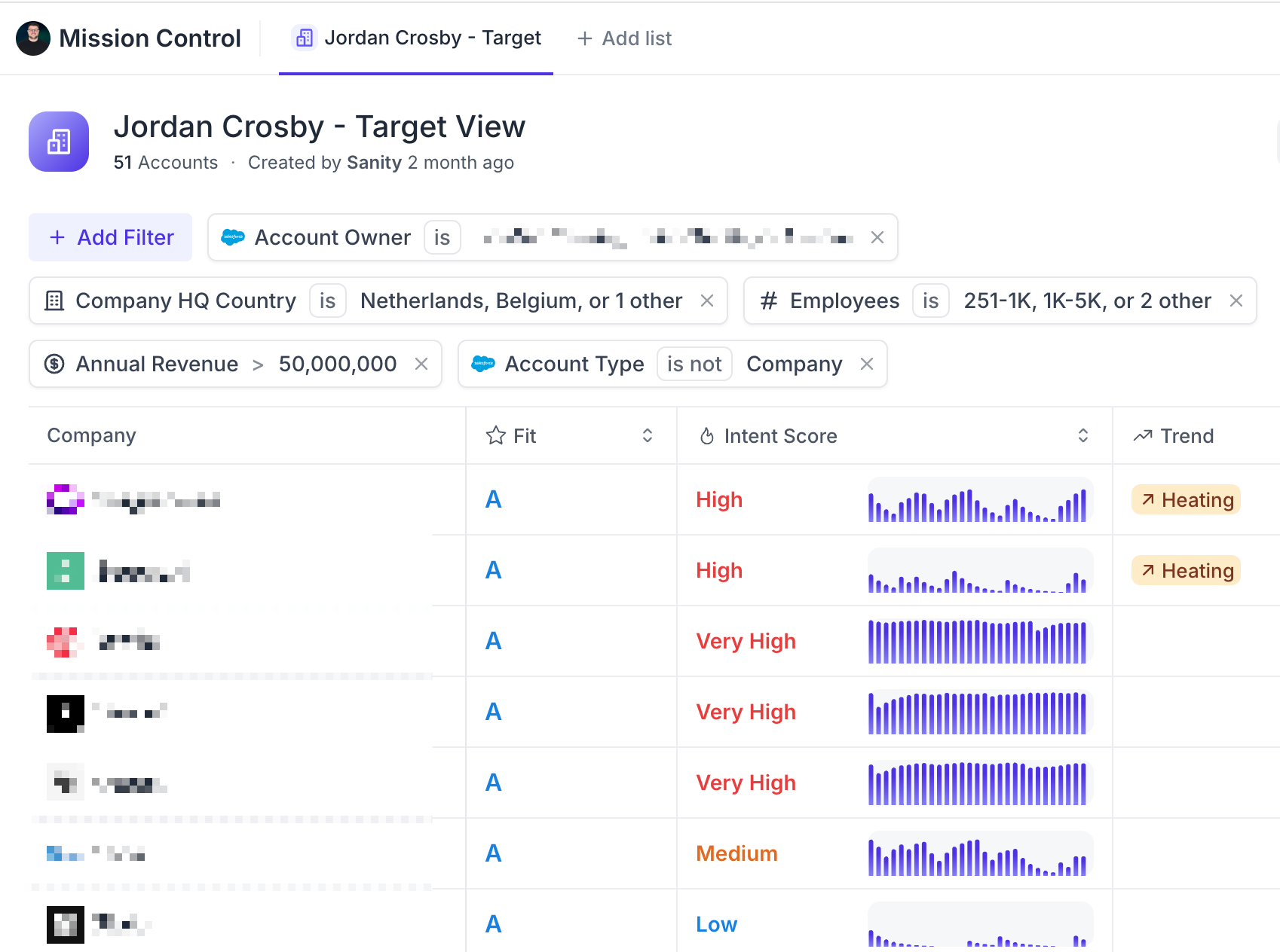 Jordan Crosby, a top SDR in EMEA, starts his day in Koala, deciding how to best focus his efforts across a sea of prospects that could use Sanity – a content management platform used by 500,000 developers.