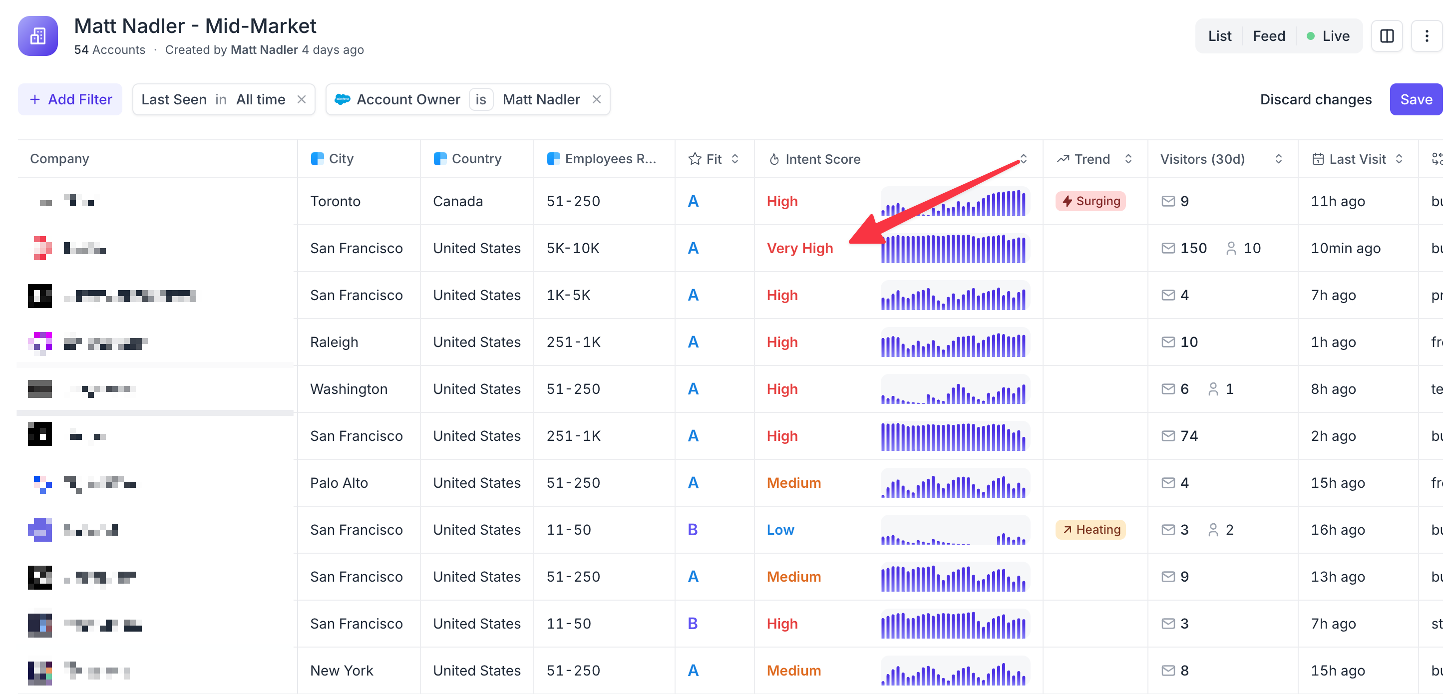 He shared that one of the most valuable aspects of the account view is seeing the intent score which allows him to quickly identify any meaningful surges in activity such as prospects checking out specific pages on the Retool website or signing up for the product.
