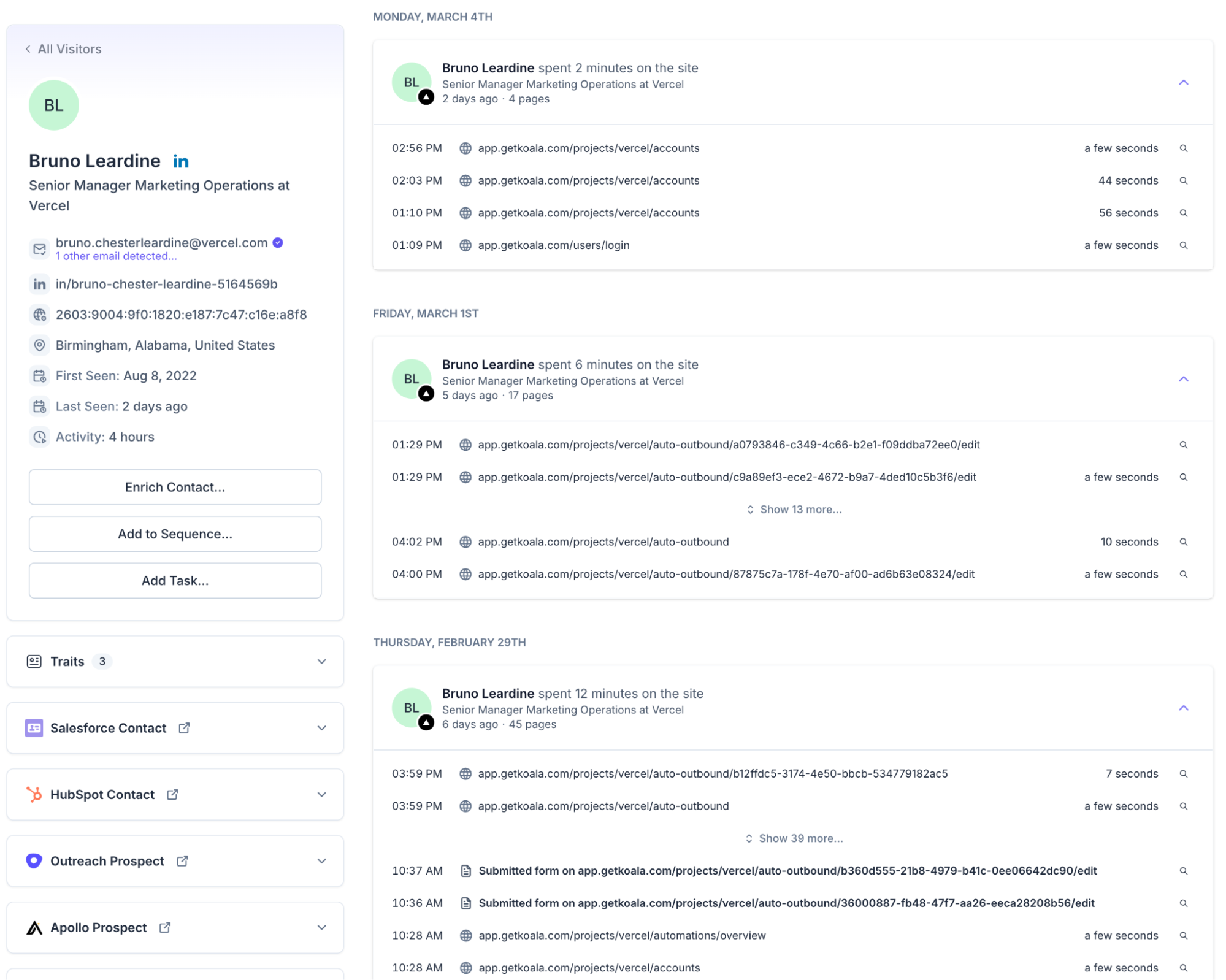 Koala allows optional collection of product analytics data. At a minimum, this should be leveraged for resolving identity of anyone signing up / logging into the platform (see Part 1), but can also be incredibly useful data for sellers to have at their fingertips to understand which end-users are already using the app. This is especially useful in a PLG context so you can get an understanding of who your champions might be, or a POC context where you can see how the POC is trending in terms of usage.