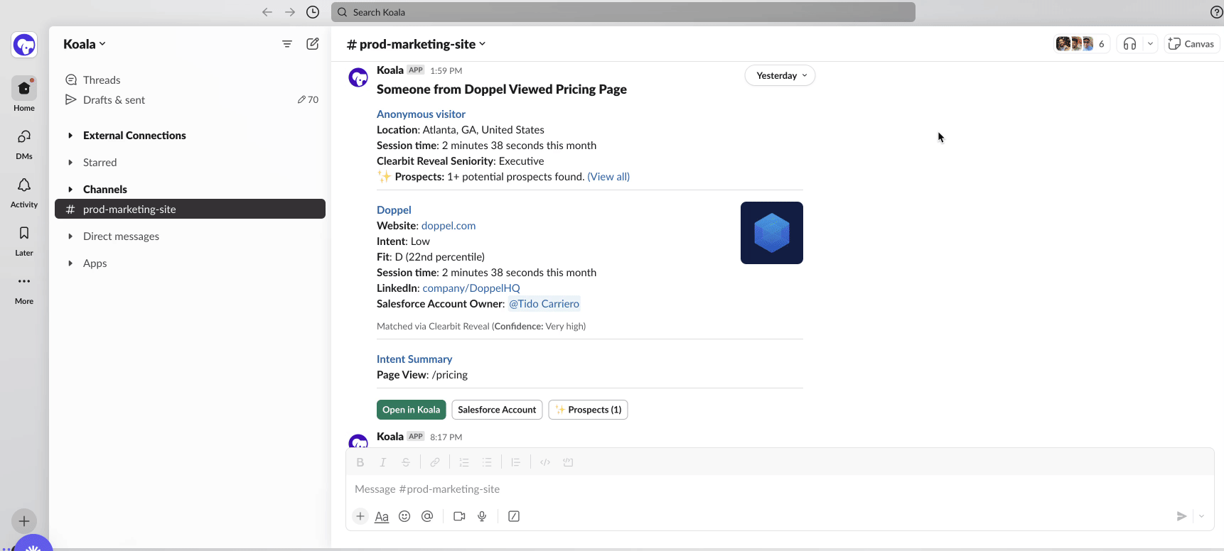 By triangulating the attributes of your anonymous visitors, we’ll help you take an educated guess at who the prospect might be — with a new button in Slack alerts to quickly start your search.
