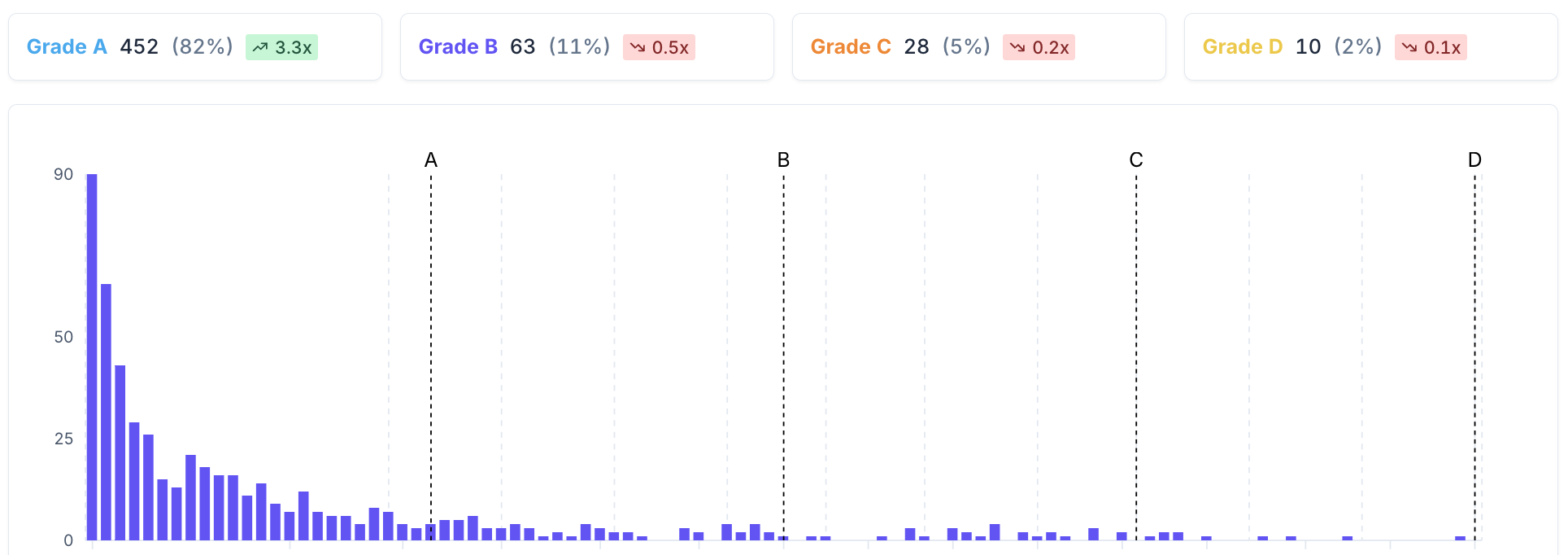 Koala assigns an ICP Fit based on the firmographic characteristics in the account. You can combine Koala account data, Clearbit data, and your CRM data to build a multi-dimensional Fit score. This model is built by performing a frequency test between the converted population (typically customers won by a sales-led motion) against the population (typically everyone on your website). We bucket the scores into four grades, A for the top 25% of traffic, B for the next 25%, C for the next 25%, and D for the bottom 25%. We encourage interpreting these scores as follows: