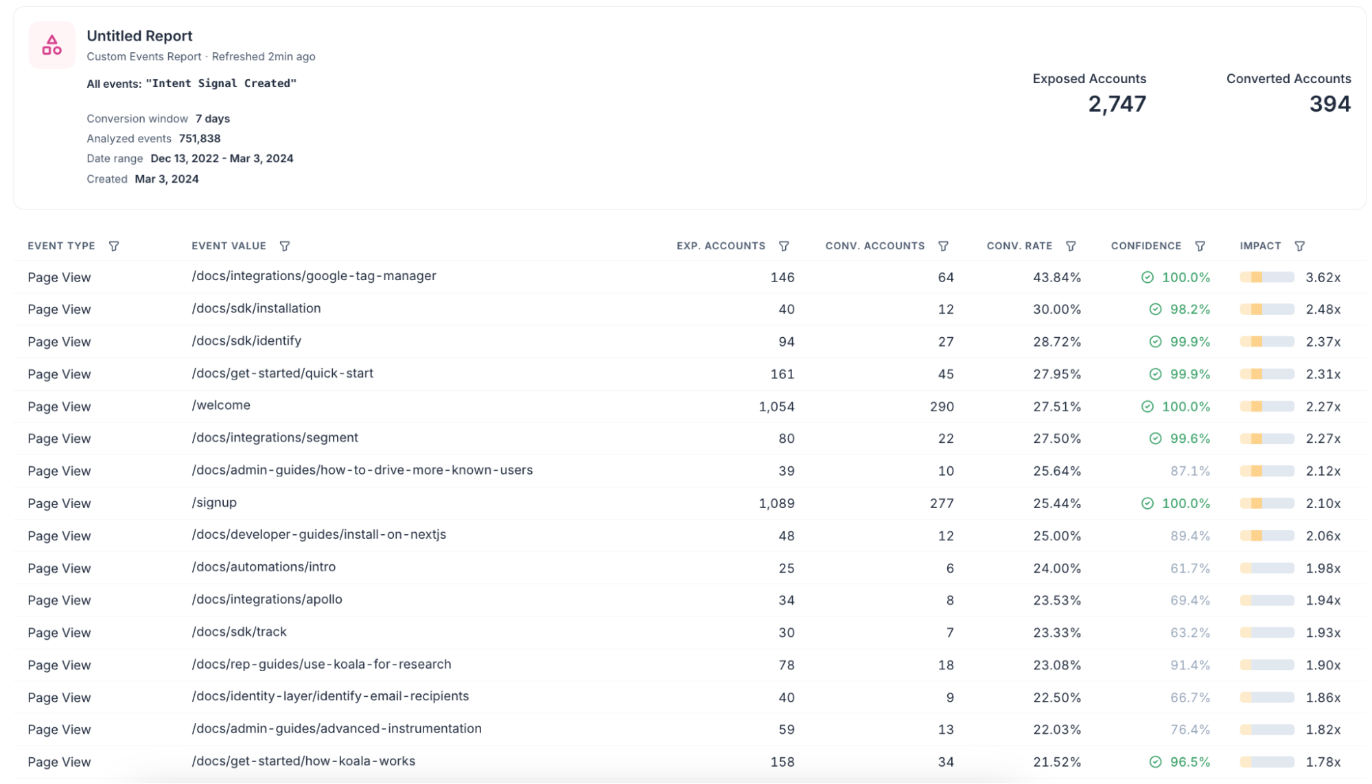 It's easier to show than explain, so here's a report of what marketing content consumption leads up to the main activation moment we care about in the product ("Intent Signal Created").