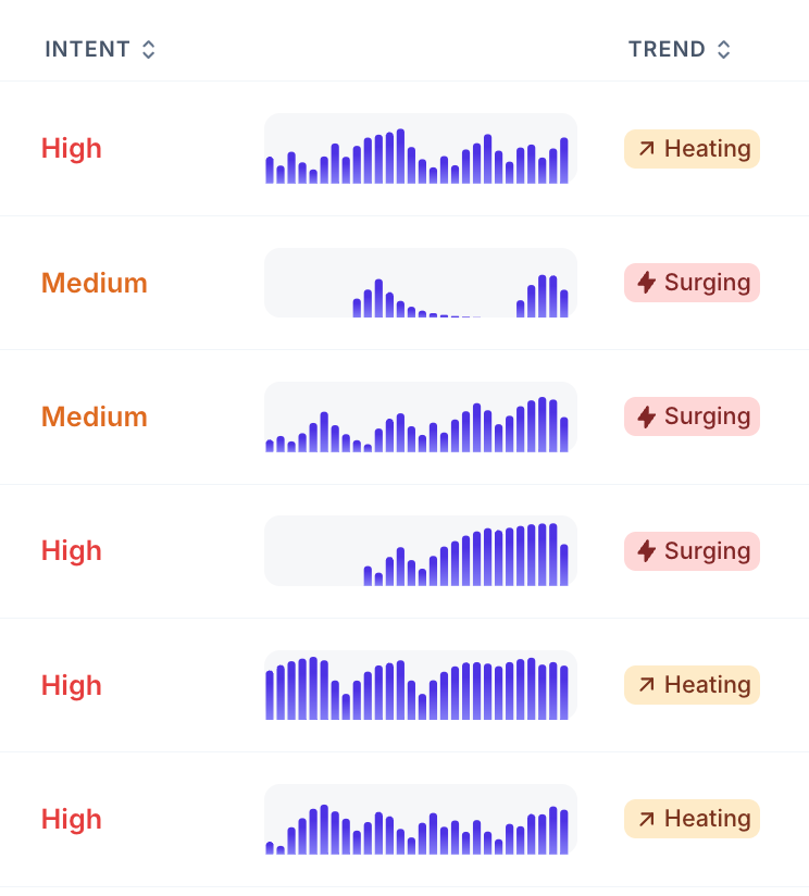 Finally, this intent is rolled-up into a score 0-100. The score takes into account active session time, pageviews, number of users, how many intent signals recently happened, etc. Here's a screenshot of what this looks like in the app )each bar represents 1 day):