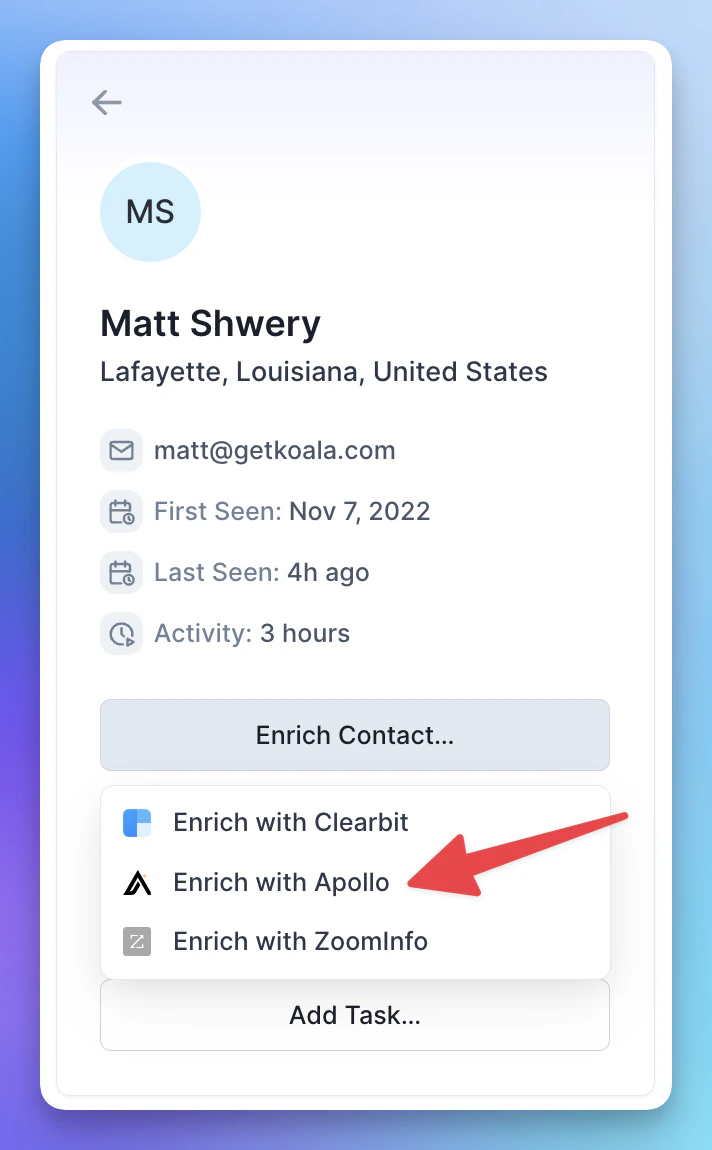 When you come across a known user in Koala, you can click “Enrich Contact…” and choose “Enrich with Apollo”: