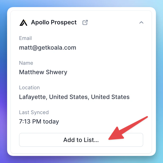 From any Koala profile, you can take action directly in Apollo, or set up an automation based on an intent signal. Koala supports adding to a list (pictured below), adding to a sequence, or creating a task.