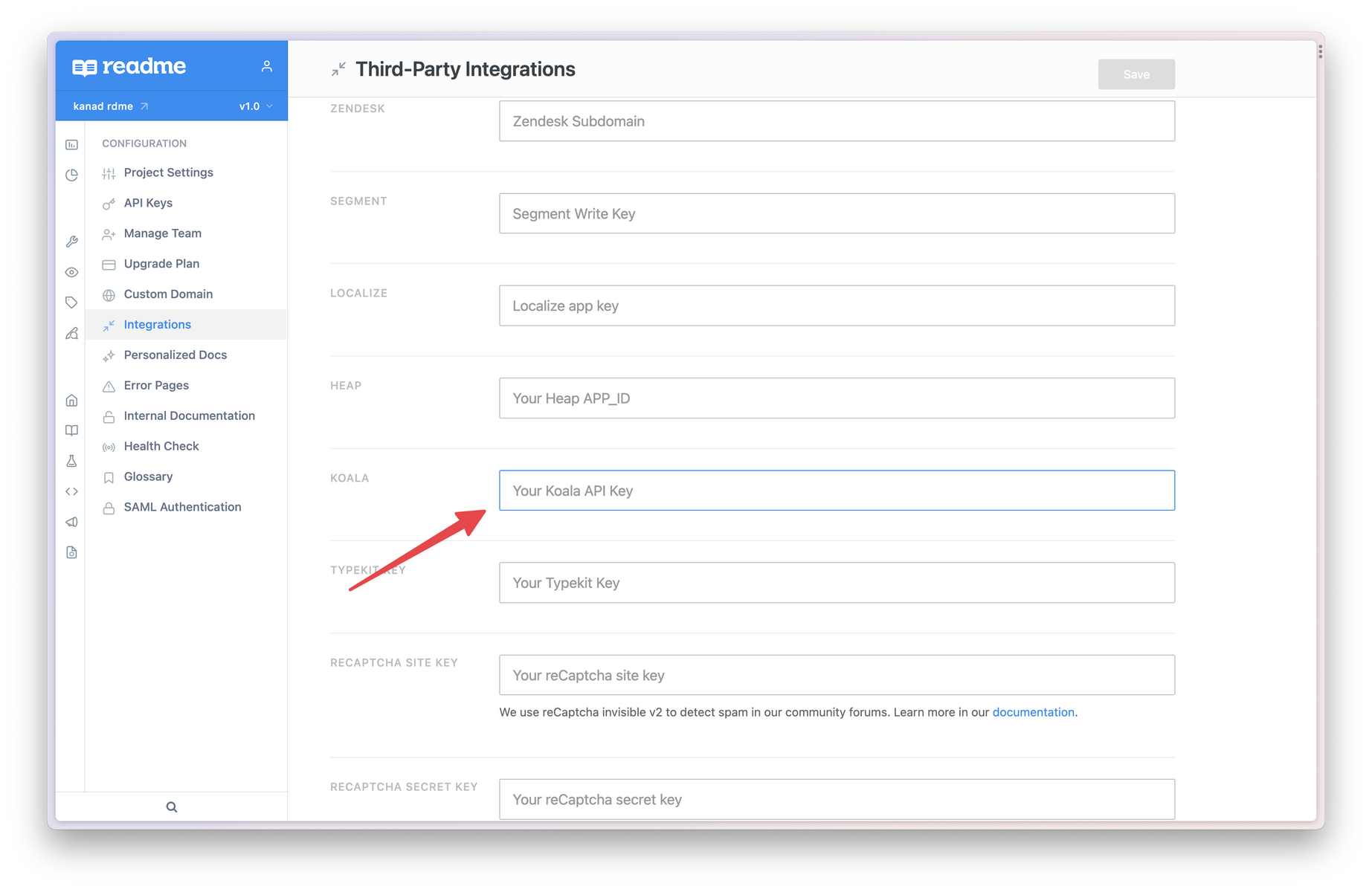 Navigate to the Integrations settings in the ReadMe dashboard, paste in your Koala API key, and click Save.
