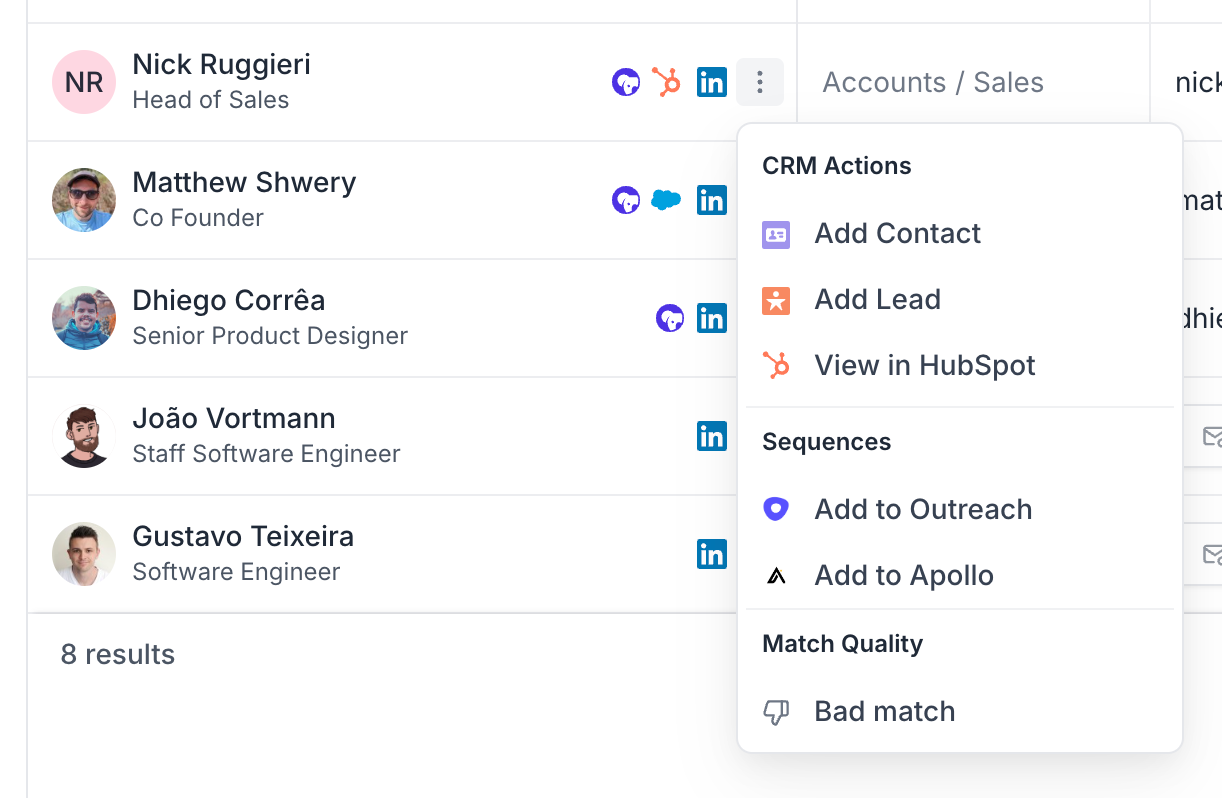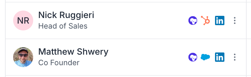 2. CRM: SFDC / Hubspot logos indicate that there is a record in your CRM — click the icon to be brought to the CRM record.